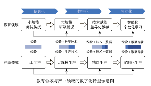 理解教育數(shù)字化轉(zhuǎn)型,需要放眼數(shù)字中國(guó)戰(zhàn)略背景。隨著數(shù)字技術(shù)逐步融入生產(chǎn),產(chǎn)業(yè)領(lǐng)域完成了從手工生產(chǎn)到精益生產(chǎn),再向著數(shù)據(jù)智能主導(dǎo)的定制化生產(chǎn)的躍遷。企業(yè)治理也從傳統(tǒng)的人力資源管控,轉(zhuǎn)向基于數(shù)據(jù)洞察和智能決策的前瞻性管理思維。教育領(lǐng)域同樣也經(jīng)歷著從師徒傳授、規(guī)?;虒W(xué)到技術(shù)賦能的差異化、智能化教學(xué)的演變(見(jiàn)上圖)。共性之外,教育的數(shù)字化轉(zhuǎn)型不同于產(chǎn)業(yè)領(lǐng)域,關(guān)注的是人的發(fā)展的智能個(gè)性化。教育生態(tài)本身的復(fù)雜特性,加之?dāng)?shù)字技術(shù)融入教育領(lǐng)域落后于產(chǎn)業(yè)領(lǐng)域,亟須聚焦于數(shù)據(jù)智能與教師決策雙驅(qū)動(dòng)、“人機(jī)協(xié)同”的新教育范式的實(shí)踐探索。