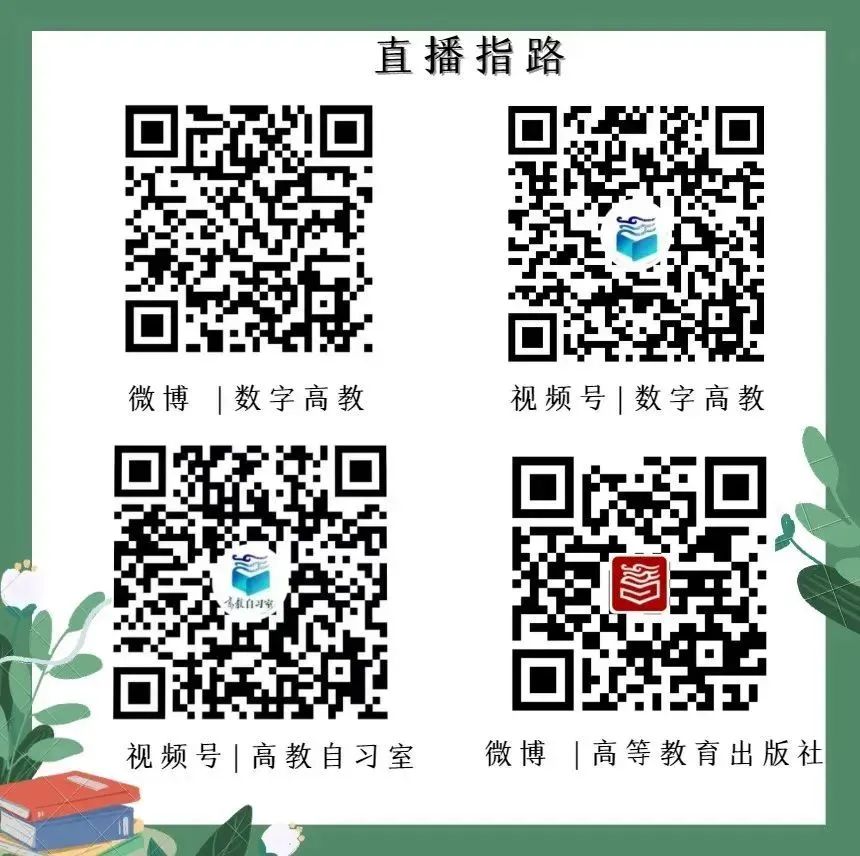 本次活動將通過數(shù)字高教視頻號、數(shù)字高教微博、高教自習室視頻號、高等教育出版社官方微博進行全網直播,掃碼即可觀看。