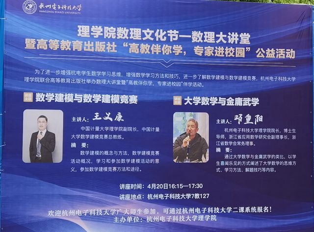 本次活動(dòng)分別在浙江工業(yè)大學(xué)、杭州電子科技大學(xué)、中國(guó)計(jì)量大學(xué)開展。中國(guó)計(jì)量大學(xué)理學(xué)院副院長(zhǎng),中國(guó)計(jì)量大學(xué)數(shù)學(xué)建模競(jìng)賽總教練王義康教授以“數(shù)學(xué)建模與數(shù)學(xué)建模競(jìng)賽”介紹了數(shù)學(xué)建模的概念與方法、數(shù)學(xué)建模競(jìng)賽活動(dòng)概況、學(xué)習(xí)和參加數(shù)學(xué)建?;顒?dòng)的意義,以及參加數(shù)學(xué)建模競(jìng)賽方法和途徑。杭州電子科技大學(xué)理學(xué)院院長(zhǎng)、浙江省高等學(xué)校中青年學(xué)科帶頭人鄧重陽(yáng)教授以“大學(xué)數(shù)學(xué)與金庸武學(xué)”為主題,通過大學(xué)數(shù)學(xué)與金庸武學(xué)的類比,以學(xué)生喜聞樂見的方式闡述了大學(xué)數(shù)學(xué)的思維方式、學(xué)習(xí)方法、解題技巧等內(nèi)容。浙江大學(xué)永平獎(jiǎng)獲得者、國(guó)家級(jí)線上一流課程負(fù)責(zé)人蘇德礦教授結(jié)合多年來的教學(xué)實(shí)踐與經(jīng)驗(yàn),就“高等數(shù)學(xué)期末考試及數(shù)學(xué)考研規(guī)劃”這一主題,為同學(xué)們深入分析了高等數(shù)學(xué)學(xué)習(xí)的重點(diǎn)、難點(diǎn)和要點(diǎn),并就如何學(xué)好高等數(shù)學(xué)、夯實(shí)數(shù)學(xué)基礎(chǔ),進(jìn)一步提升自身競(jìng)爭(zhēng)力,為今后的考研、深造做好準(zhǔn)備等方面給出了專業(yè)中肯的建議。