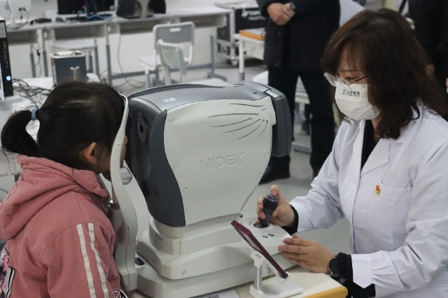 教育部職業(yè)教育與成人教育司、阜平縣委縣政府、北京一商集團(tuán)、祥龍博瑞集團(tuán)、首農(nóng)集團(tuán)相關(guān)負(fù)責(zé)人出席揭牌儀式。大明眼鏡公司首席技師和青少年近視管理工作室團(tuán)隊(duì)分享了對(duì)當(dāng)?shù)貙W(xué)生進(jìn)行眼健康篩查結(jié)果,此前該團(tuán)隊(duì)依托生產(chǎn)實(shí)訓(xùn)基地為阜平縣中小學(xué)生進(jìn)行了視力檢測(cè)、眼軸測(cè)量和眼底篩查。