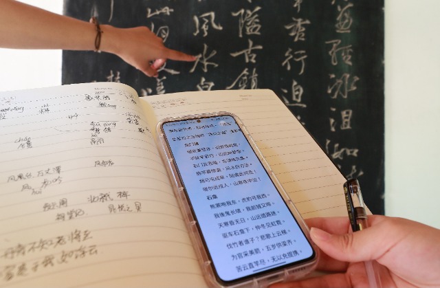 學生翻出手機,和碑文上的詩詞來一場穿越千年的“對話”。