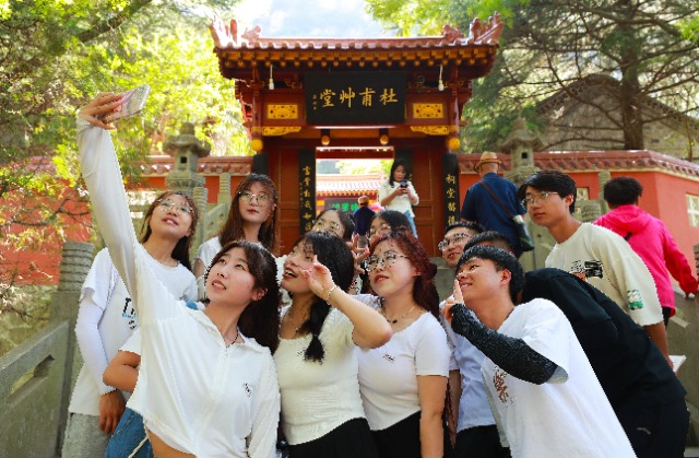 現(xiàn)場授課結束后,學生在杜甫草堂前合影留念。