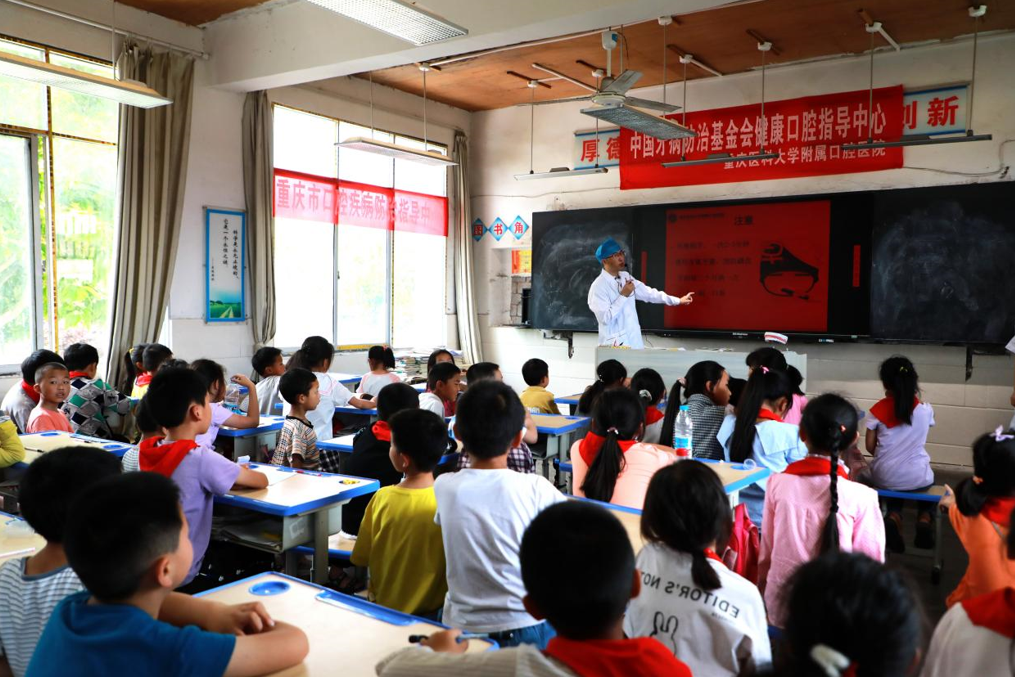 重醫(yī)附屬口腔醫(yī)院為對口幫扶的鄉(xiāng)鎮(zhèn)小學(xué)生進(jìn)行口腔健康教育。學(xué)校供圖