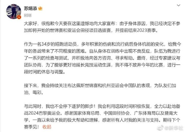 6月12日,@蘇炳添 微博宣布,由于身體原因,已經(jīng)決定不參加即將開始的田徑世錦賽和亞運(yùn)會(huì)田徑項(xiàng)目選拔賽,并提前結(jié)束2023賽季。蘇炳添說,會(huì)利用這段時(shí)間積極恢復(fù),全力以赴地備戰(zhàn)2024巴黎奧運(yùn)會(huì)。