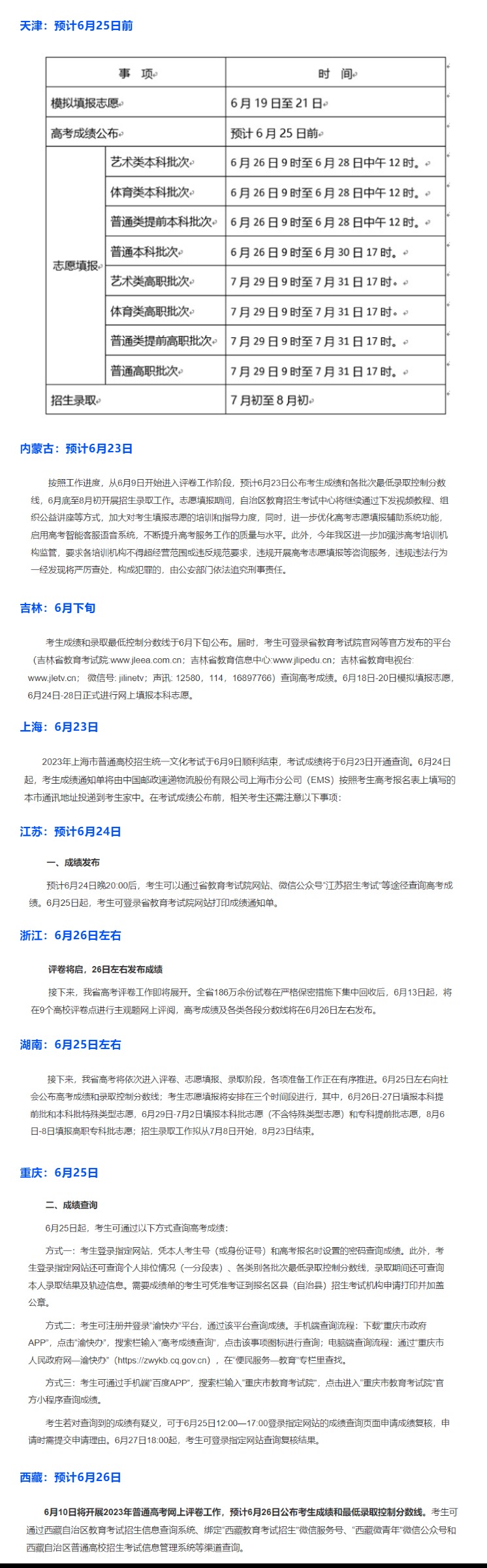 2023年全國高考10日全部結(jié)束,各地高考評卷工作正全面展開。大部分省份已公布高考放榜時間。