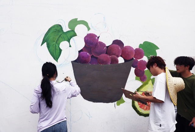 志愿者用葡萄元素在墻上繪圖。學(xué)校供圖