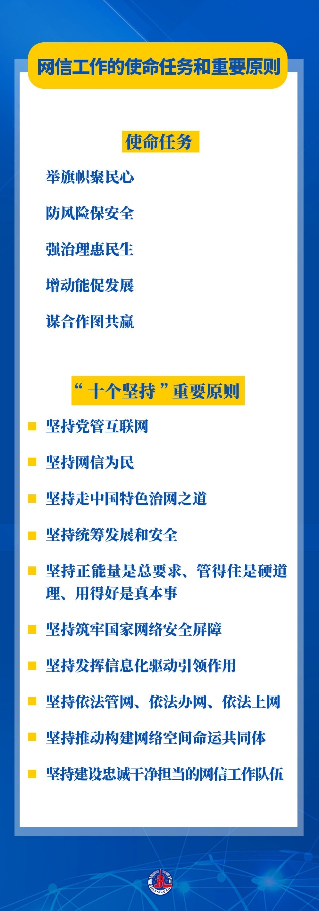 習(xí)近平總書記鮮明提出的網(wǎng)信工作“5個方面、30個字”的使命任務(wù),涵蓋互聯(lián)網(wǎng)內(nèi)容建設(shè)、網(wǎng)絡(luò)安全、網(wǎng)絡(luò)惠民、信息化建設(shè)、國際網(wǎng)絡(luò)空間治理等,“十個堅持”重要原則進(jìn)一步豐富和發(fā)展了習(xí)近平總書記關(guān)于網(wǎng)絡(luò)強(qiáng)國的重要思想,把黨對網(wǎng)信工作的規(guī)律性認(rèn)識提升到全新高度??倳浱岢龅氖姑蝿?wù)和重要原則,具有很強(qiáng)的政治性、戰(zhàn)略性、指導(dǎo)性,既著眼當(dāng)前,又謀深慮遠(yuǎn),為做好新時代新征程網(wǎng)信工作指明了前進(jìn)方向,為推進(jìn)實現(xiàn)網(wǎng)絡(luò)強(qiáng)國提供了根本遵循。