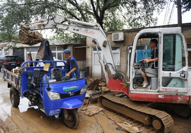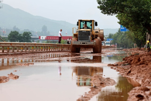 7月31日,在河北省石家莊市井陘縣307國道長崗村段,防汛工作人員駕駛機(jī)械清理淤泥。新華社發(fā)(梁子棟 攝)