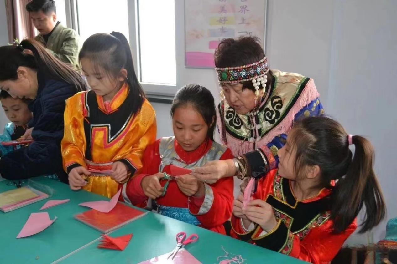 國家級非物質(zhì)文化遺產(chǎn)傳承人關金芳(右二)在教孩子們學剪紙。