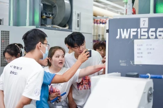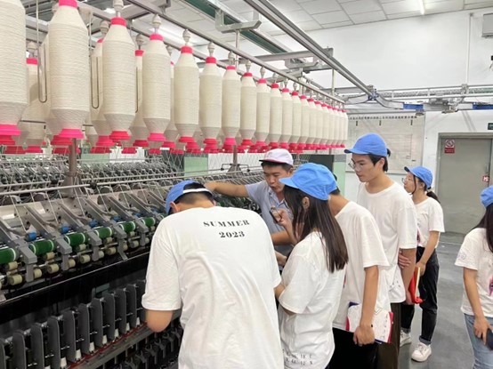 第五期援疆團(tuán)成員、昌吉溢達(dá)紡織有限公司車(chē)間主任張躍明帶領(lǐng)同學(xué)們?cè)谏a(chǎn)車(chē)間參觀。學(xué)校供圖