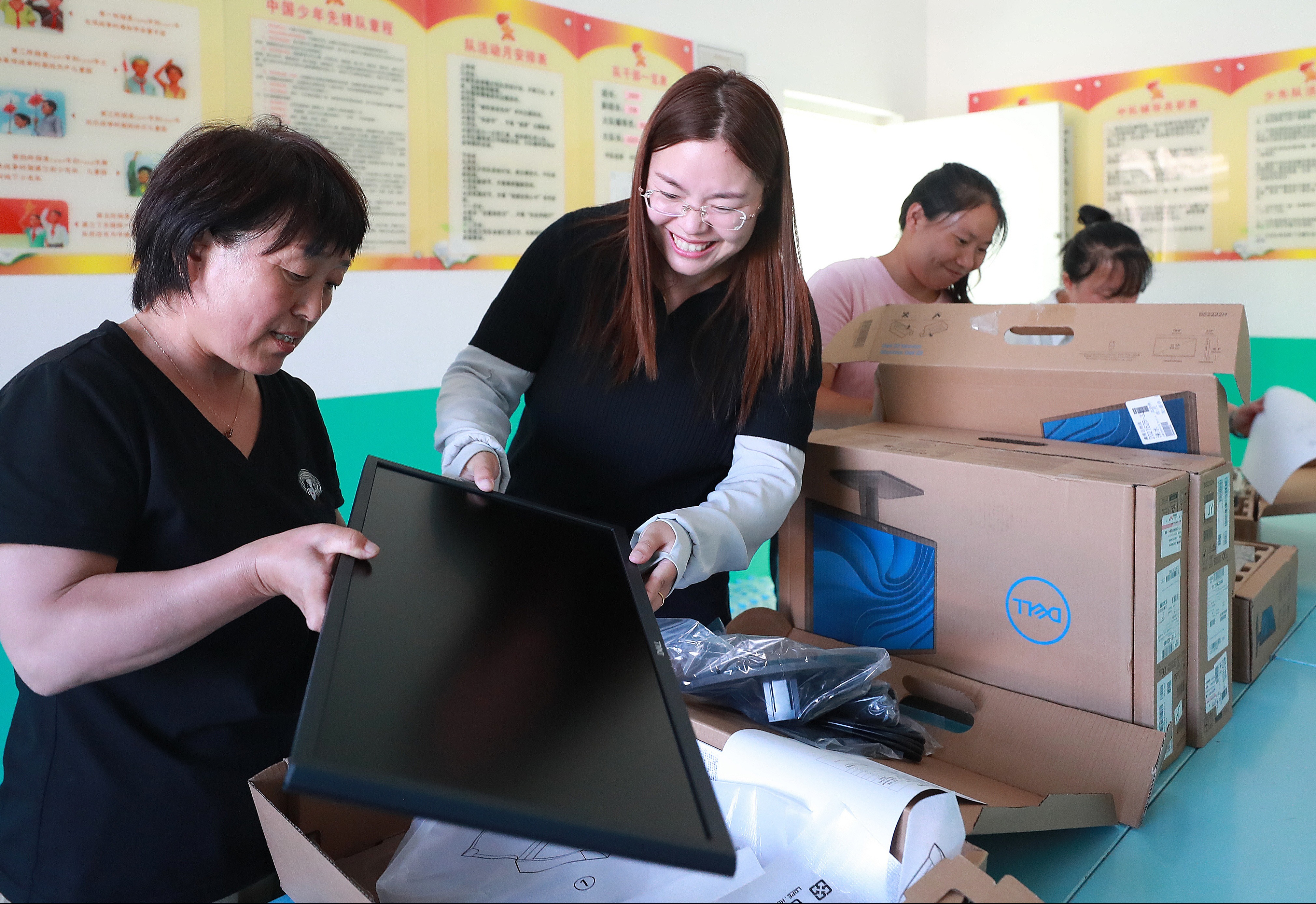 8月22日,河北省淶水縣三坡學(xué)區(qū)馬各莊小學(xué)校長張文玲(左一)和老師們一起安裝新電腦。