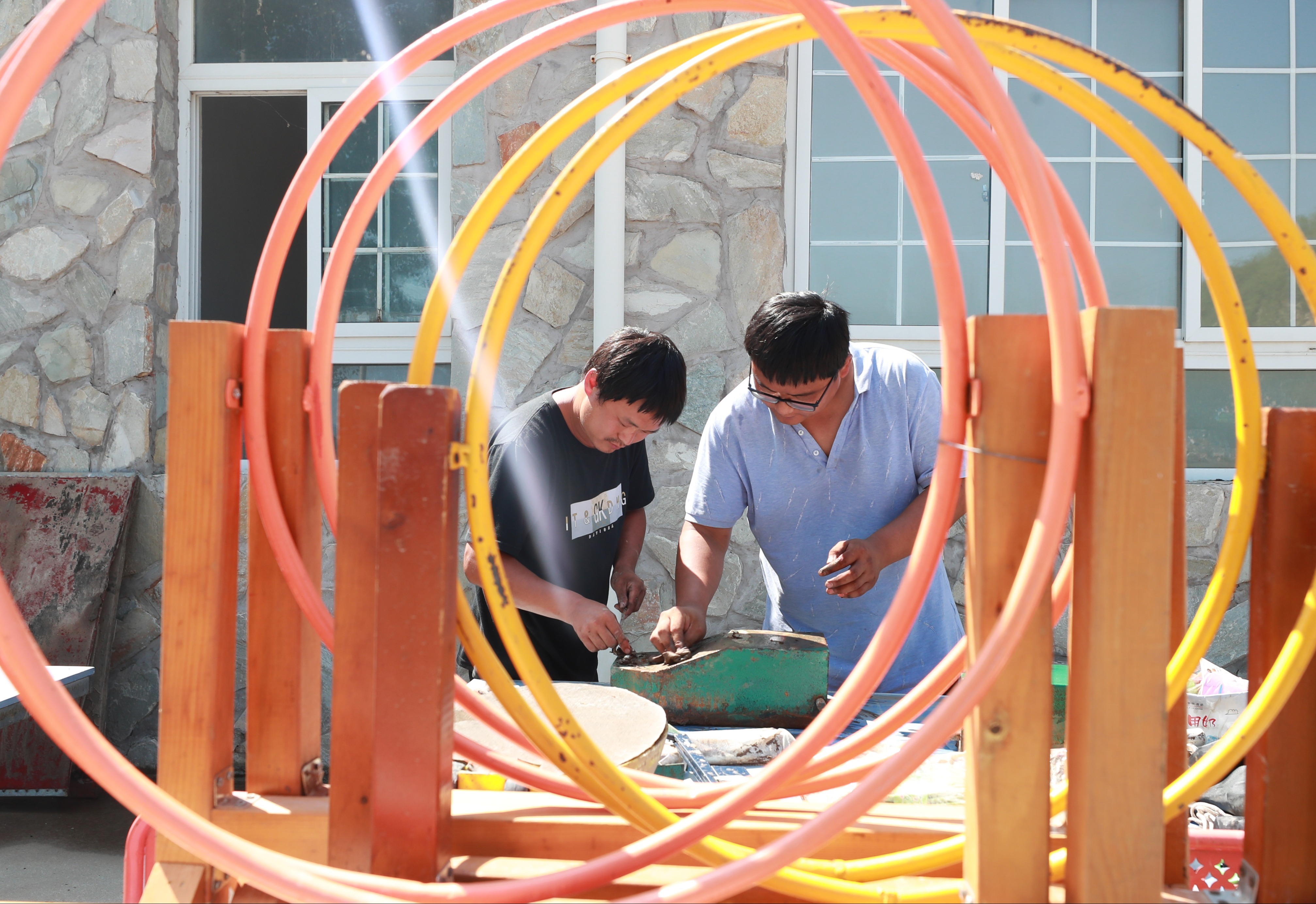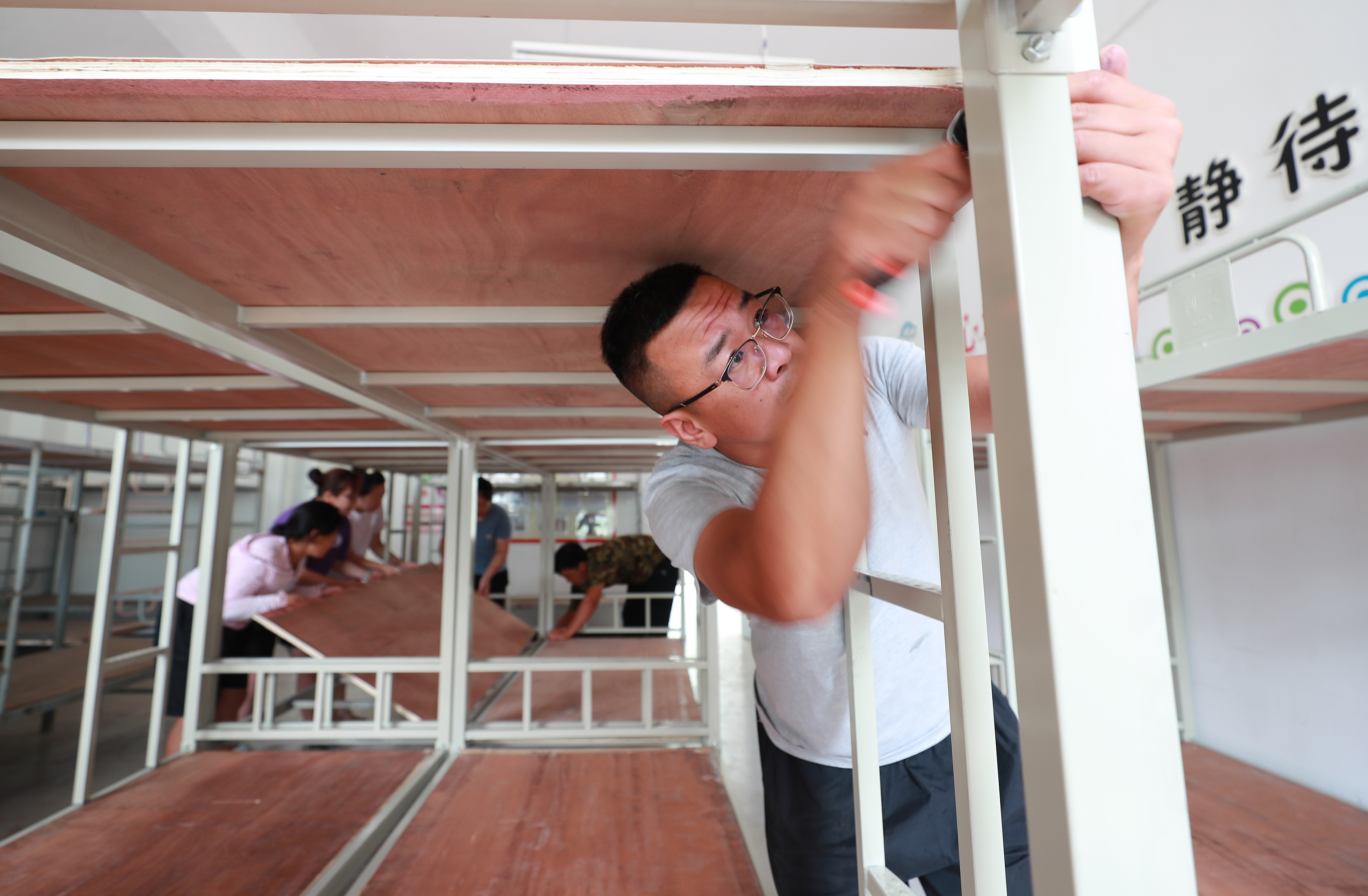 8月23日,淶水縣其中口小學(xué)教師在學(xué)生宿舍安裝新購置的上下床。