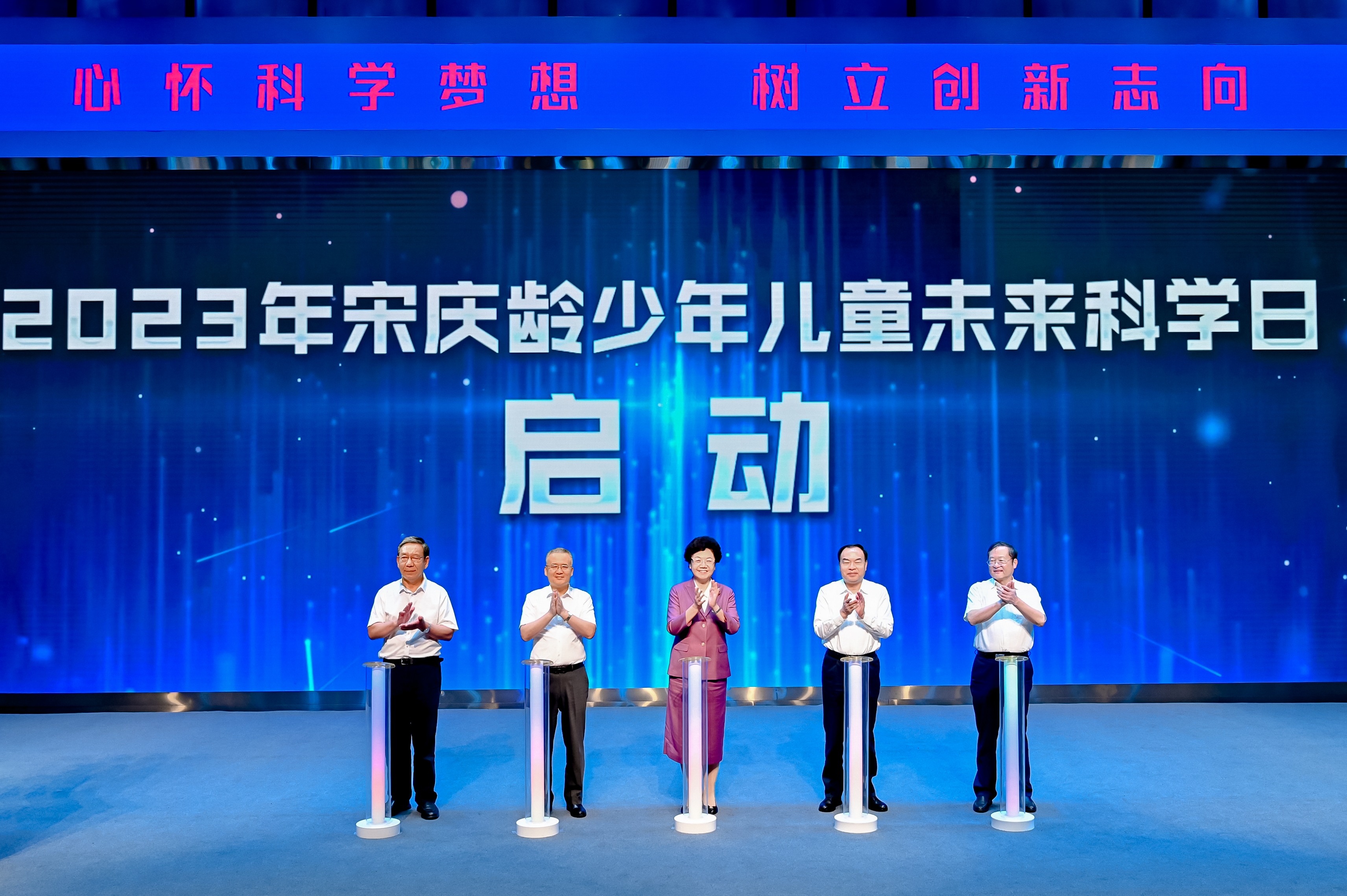 活動(dòng)現(xiàn)場(chǎng),李斌、唐良智、孟慶海與中國(guó)科學(xué)院院士、中國(guó)科學(xué)技術(shù)大學(xué)教授、安徽省政協(xié)副主席鄭永飛,中國(guó)工程院院士、深空探測(cè)實(shí)驗(yàn)室主任兼首席科學(xué)家吳偉仁共同啟動(dòng)2023年宋慶齡少年兒童未來(lái)科學(xué)日。