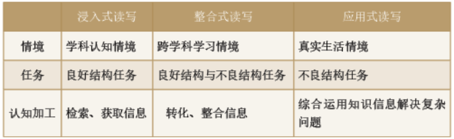 不同情境下的三類讀寫并非截然分開,而是呈現(xiàn)進(jìn)階升級(jí)又互相聯(lián)通的關(guān)系。學(xué)習(xí)情境從學(xué)科認(rèn)知情境到跨學(xué)科學(xué)習(xí)情境到真實(shí)生活情境,問題任務(wù)從良好結(jié)構(gòu)到不良結(jié)構(gòu),認(rèn)知加工從獲取信息的淺加工到整合運(yùn)用知識(shí)解決真實(shí)和復(fù)雜問題的深度加工,最終實(shí)現(xiàn)由做題到做事到做人,由知識(shí)到素養(yǎng),由單一學(xué)科素養(yǎng)到融合發(fā)展素養(yǎng)的讀寫模式轉(zhuǎn)型。