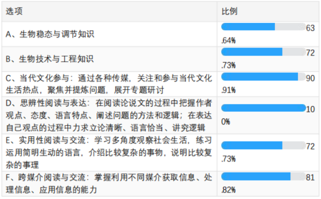 應(yīng)用式讀寫重在“通過讀寫學(xué)習(xí)”解決真實(shí)問題,同時(shí)在遷移應(yīng)用中“學(xué)習(xí)讀寫”,做到兩者的兼顧與平衡。北京市亦莊實(shí)驗(yàn)中學(xué)和北京四中作為項(xiàng)目實(shí)驗(yàn)學(xué)校,均在疫情期間開發(fā)了應(yīng)用式讀寫課程,以項(xiàng)目化學(xué)習(xí)的方式進(jìn)行教學(xué)實(shí)踐,成效顯著。亦莊實(shí)驗(yàn)中學(xué)以“作為國(guó)家民間智庫(kù)的研究員,全面研究2020年疫情并形成《國(guó)家突發(fā)公共衛(wèi)生事件應(yīng)急預(yù)案》”為核心任務(wù),開展跨學(xué)科項(xiàng)目化學(xué)習(xí),所有模塊的學(xué)習(xí)都以讀寫作為學(xué)習(xí)手段。如模塊一“認(rèn)識(shí)新冠疫情的真面目”,其任務(wù)是提交一篇科普短文并錄制中英雙語的宣傳視頻,完成一次科學(xué)普及活動(dòng)。該項(xiàng)目化學(xué)習(xí)的最終成果是以小組為單位形成《國(guó)家突發(fā)公共衛(wèi)生事件應(yīng)急預(yù)案》,“預(yù)案”需要運(yùn)用前幾個(gè)模塊的結(jié)論與圖表,并插入組織結(jié)構(gòu)圖與流程圖。此課程的學(xué)科融合度、項(xiàng)目化程度高,以讀寫作為學(xué)習(xí)方式和思維方式完成真實(shí)任務(wù)、解決真實(shí)問題,促進(jìn)了學(xué)生科學(xué)素養(yǎng)與人文素養(yǎng)的綜合提升。北京四中則開展以“病毒和疫苗”為主題的項(xiàng)目式學(xué)習(xí),項(xiàng)目組的語文和生物教師,希望“能和同學(xué)們一起從我們的課桌、我們的作業(yè)、我們的考綱中抬起頭來,重新學(xué)習(xí)點(diǎn)什么,思考點(diǎn)什么,并將所學(xué)所思投入這場(chǎng)尚未結(jié)束的災(zāi)難”。課程結(jié)束后,課題組組織了問卷調(diào)研,其中一道題的調(diào)研數(shù)據(jù)如表2。
