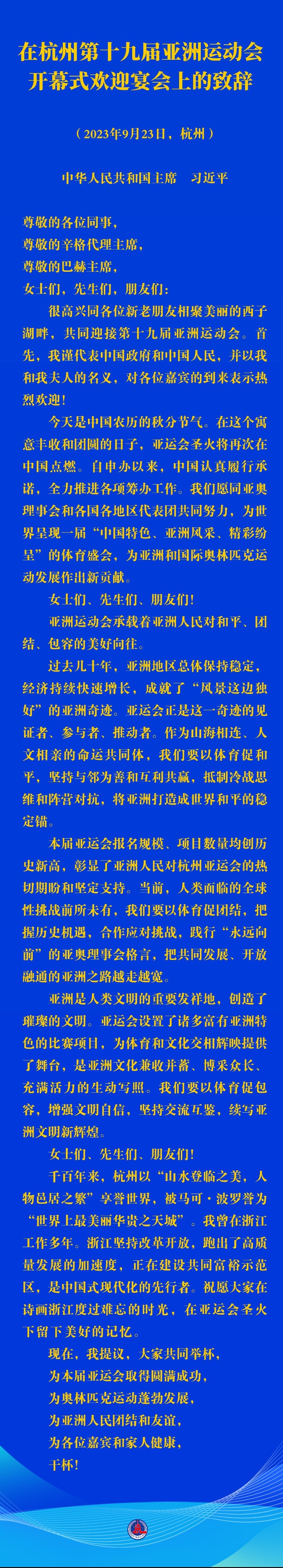 很高興同各位新老朋友相聚美麗的西子湖畔,共同迎接第十九屆亞洲運動會。首先,我謹(jǐn)代表中國政府和中國人民,并以我和我夫人的名義,對各位嘉賓的到來表示熱烈歡迎!