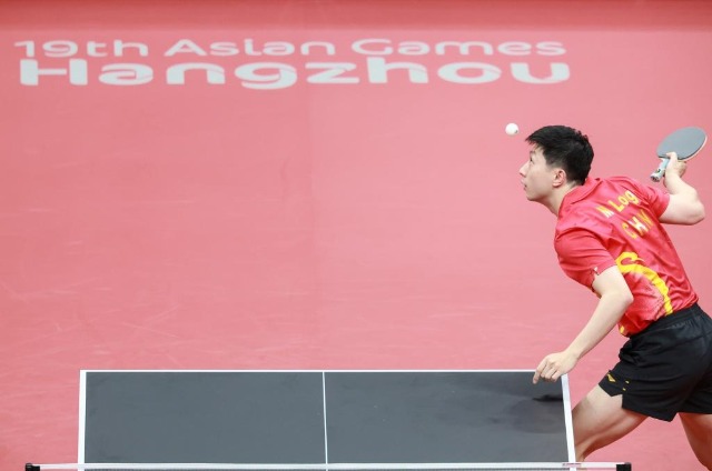 9月22日,中國隊(duì)選手馬龍?jiān)诒荣愔邪l(fā)球。新華社記者 劉續(xù) 攝
