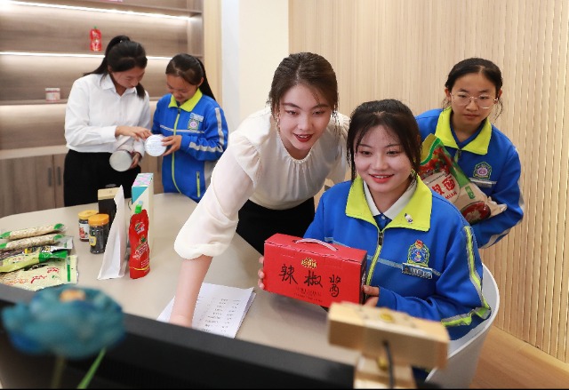 電子商務(wù)坊,教師王夢飛(中)和學(xué)生一起參與直播帶貨,引導(dǎo)學(xué)生關(guān)注評價反饋,不斷提升吸引力。