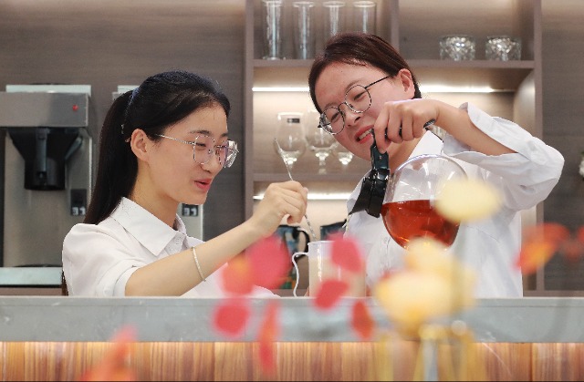 中國教育報-中國教育新聞網(wǎng)訊(通訊員 尹曉軍 記者 張學(xué)軍)伴隨著古典清雅的音樂,“茶藝師”身著漢服,氣定神閑、舉止優(yōu)雅,溫具、置茶、沖泡、奉茶……一雙巧手在茶席間流轉(zhuǎn),一低頭一舉杯,精妙的茶藝、醇厚的茶香,讓人流連忘返。
