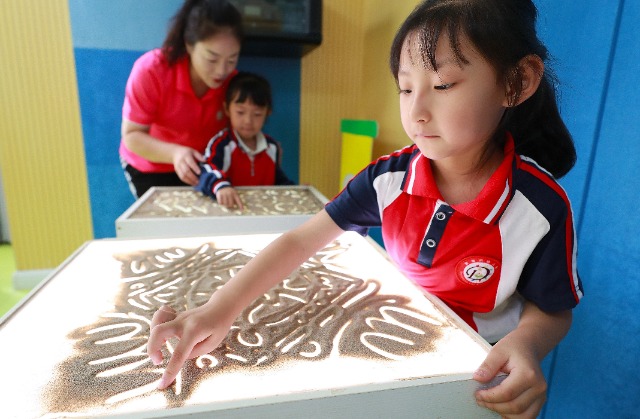 9月15日,敦煌市幼兒園小朋友在手繪沙畫。