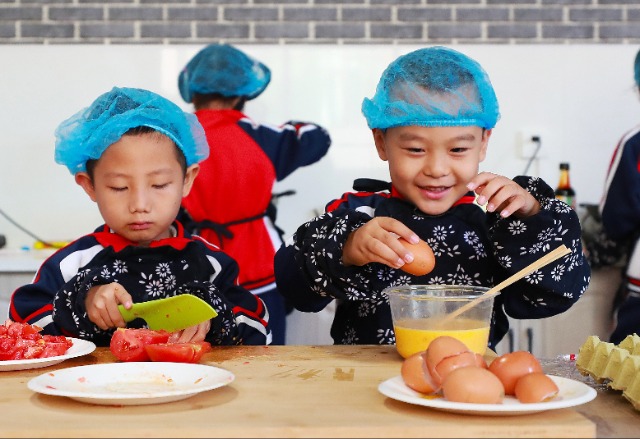 打雞蛋、切西紅柿,敦煌市幼兒園為西紅柿炒雞蛋做準(zhǔn)備。