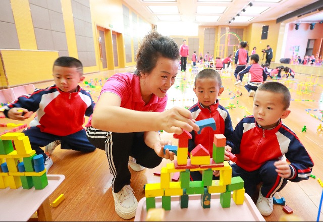 9月15日,敦煌市幼兒園,老師與小朋友一起搭積木。