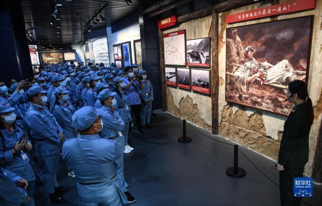 在紅軍長征湘江戰(zhàn)役紀(jì)念館的油畫《陳樹湘》前,黨員們聆聽講解員講述陳樹湘為蘇維埃流盡最后一滴血的故事(2021年5月18日攝)。新華社記者 張愛林 攝