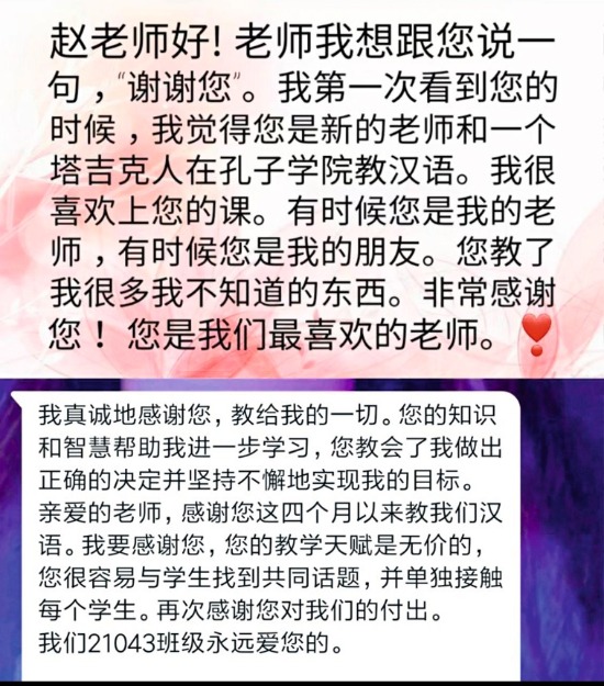 我出生在塔吉克斯坦一個(gè)平凡的小鄉(xiāng)村,如果沒(méi)有選擇學(xué)習(xí)中文,我也可能像大多數(shù)塔吉克女孩一樣,大學(xué)畢業(yè)后結(jié)婚生子,照顧家庭,過(guò)著簡(jiǎn)單而平凡的生活。而今,我不但成為一名中文教師,而且即將與我的中國(guó)男友組建家庭。正是我與中文的緣分,讓我有了事業(yè)、家庭別樣的精彩。我感謝生活,感謝許許多多幫助和關(guān)心我的人。我愿意做一束光,照亮更多孩子的人生之路。在三尺講臺(tái),繼續(xù)講述我與中國(guó)的故事,講好中國(guó)發(fā)展的故事,讓更多人了解真實(shí)、立體、全面的中國(guó)。