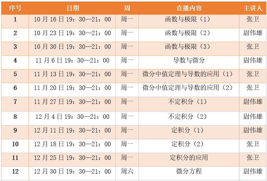 “高等數(shù)學(xué)重難點(diǎn)穿透輔導(dǎo)”系列直播課程內(nèi)容結(jié)合《同濟(jì)第八版 穿透輔導(dǎo)與習(xí)題全解》的知識要點(diǎn)與考點(diǎn)分析,對高等數(shù)學(xué)常考題型及重難點(diǎn)題型進(jìn)行思路點(diǎn)竅,聯(lián)系考研數(shù)學(xué)實(shí)際提供多角度解題技法,重點(diǎn)突出,實(shí)用性強(qiáng)。直播課程特邀長期從事考研數(shù)學(xué)教學(xué)工作的張衛(wèi)與尉偉雄老師作為主講嘉賓,兩位老師也將在講解中密切結(jié)合考研數(shù)學(xué)大綱,為將來準(zhǔn)備考研的同學(xué)提供專業(yè)的學(xué)習(xí)指南。因此,無論是為了把握高數(shù)重難點(diǎn),還是為將來考研做準(zhǔn)備,同學(xué)們都能從直播中獲益匪淺。