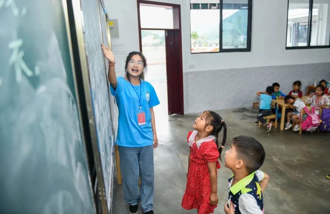 貴州應(yīng)用技術(shù)職業(yè)學(xué)院學(xué)生志愿者在黔西南布依族苗族自治州安龍縣招堤街道海莊村輔導(dǎo)學(xué)生。 劉朝富 攝