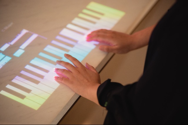“印跡”設(shè)有兩個(gè)投影鍵盤,為不同年齡、不同音樂水平的觀眾提供簡(jiǎn)短創(chuàng)作的機(jī)會(huì),完成的作品會(huì)在多媒體墻面上以傳統(tǒng)五線譜的形式呈現(xiàn)出來,同時(shí)后臺(tái)還會(huì)將樂譜轉(zhuǎn)換成一段音頻,參觀者可以用手機(jī)掃描對(duì)應(yīng)的二維碼以保存或展示自己的創(chuàng)作。不僅如此,參觀者還可以在此創(chuàng)作視覺藝術(shù)作品,盡情發(fā)揮自己的想象力和創(chuàng)造力。