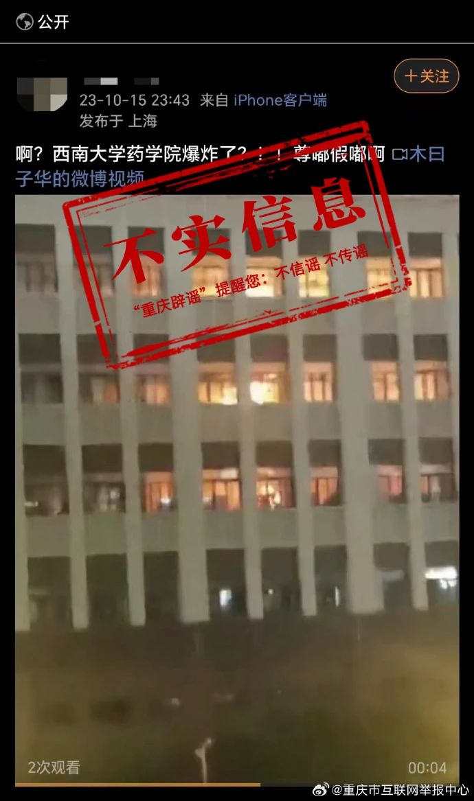 10月16日,重慶市互聯(lián)網(wǎng)舉報(bào)中心官方微博對(duì)此進(jìn)行辟謠:經(jīng)向西南大學(xué)校方求證,此為不實(shí)信息。學(xué)校注意到該情況后,立即通知相關(guān)部門對(duì)每個(gè)樓層進(jìn)行排查,未發(fā)現(xiàn)任何爆炸相關(guān)情況。目前,該條微博信息已無法正常打開,謠言線索已轉(zhuǎn)交相關(guān)部門進(jìn)一步核查。