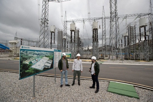 2022年9月30日,在巴西里約熱內(nèi)盧美麗山特高壓輸電二期項目里約換流站,國網(wǎng)巴控公司換流站運維主管(中)和巴方人員交談。新華社記者 王天聰 攝