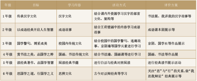 “936”校本課程側(cè)重于培養(yǎng)學生綜合素質(zhì),每類課程設(shè)計既兼顧年級差異,又注重前后的銜接與貫通。每學年9月是國學月,從一年級漢字中的國學,到二年級成語中的國學,一直到六年級學生進行思與行的辯論(見表1)。3月是讀書節(jié),根據(jù)各年級語文教學和主題研究課的需要,為每個年級精選不同的書目,孩子們通過閱讀進行分享、寫作和應(yīng)用拓展。6月是特色“六一”活動,一年級“職業(yè)體驗”,二年級“夜宿王府”,三年級“美食制作”,四年級“學軍”和“十歲成長禮”,五年級“游學”,六年級“義賣”。通過逐級遞進的校本課程,學生在傳統(tǒng)文化、閱讀素養(yǎng)、勞動技能等方面一步步積累、沉淀,讓綜合素質(zhì)慢慢而扎實地提升。