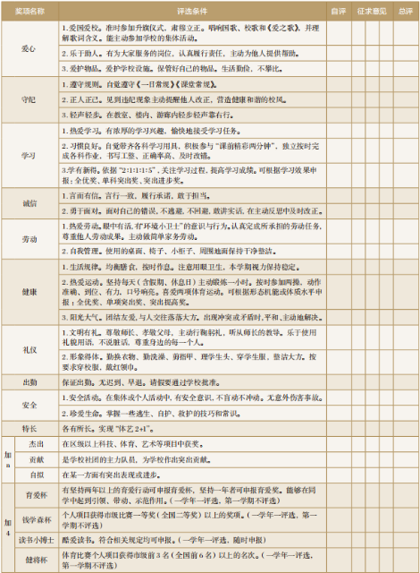 沒有賞識就沒有教育,每個孩子都有得到贊賞的渴望。期末“10+n+4”的評選(見表2),目的是為不同層面的學生提供得到賞識的機會,讓每個學生的閃光點都能被發(fā)現(xiàn)、發(fā)揚。一學期結(jié)束后,每個學生都會在10個方面開展自評和他評,包括愛心、守紀、學習、誠信、勞動、健康、禮儀、出勤、安全、特長等,每個方面都有相應(yīng)的具體表現(xiàn)供學生參考。“+n”獎包括“杰出”獎,要求在區(qū)級以上科技、體育、藝術(shù)等項目中獲獎;“貢獻”獎要求是學校社團的主力隊員,為學校作出突出貢獻;如果在某一方面有突出表現(xiàn)或進步的則可以申報“自擬”獎?!?4”獎包括育愛杯、錢學森杯、讀書小博士、健將杯,分別針對學生的品德、能力、閱讀、體育等方面進行評選。上述獎項設(shè)計體現(xiàn)多層次、多維度的評價框架,同時針對學生的個性化學習與活動參與進行了特別的設(shè)計。評價體系中,沒有“最好”只有“更好”,目的是使每個孩子都能被看見,都能在未來創(chuàng)造出更多的可能性。
