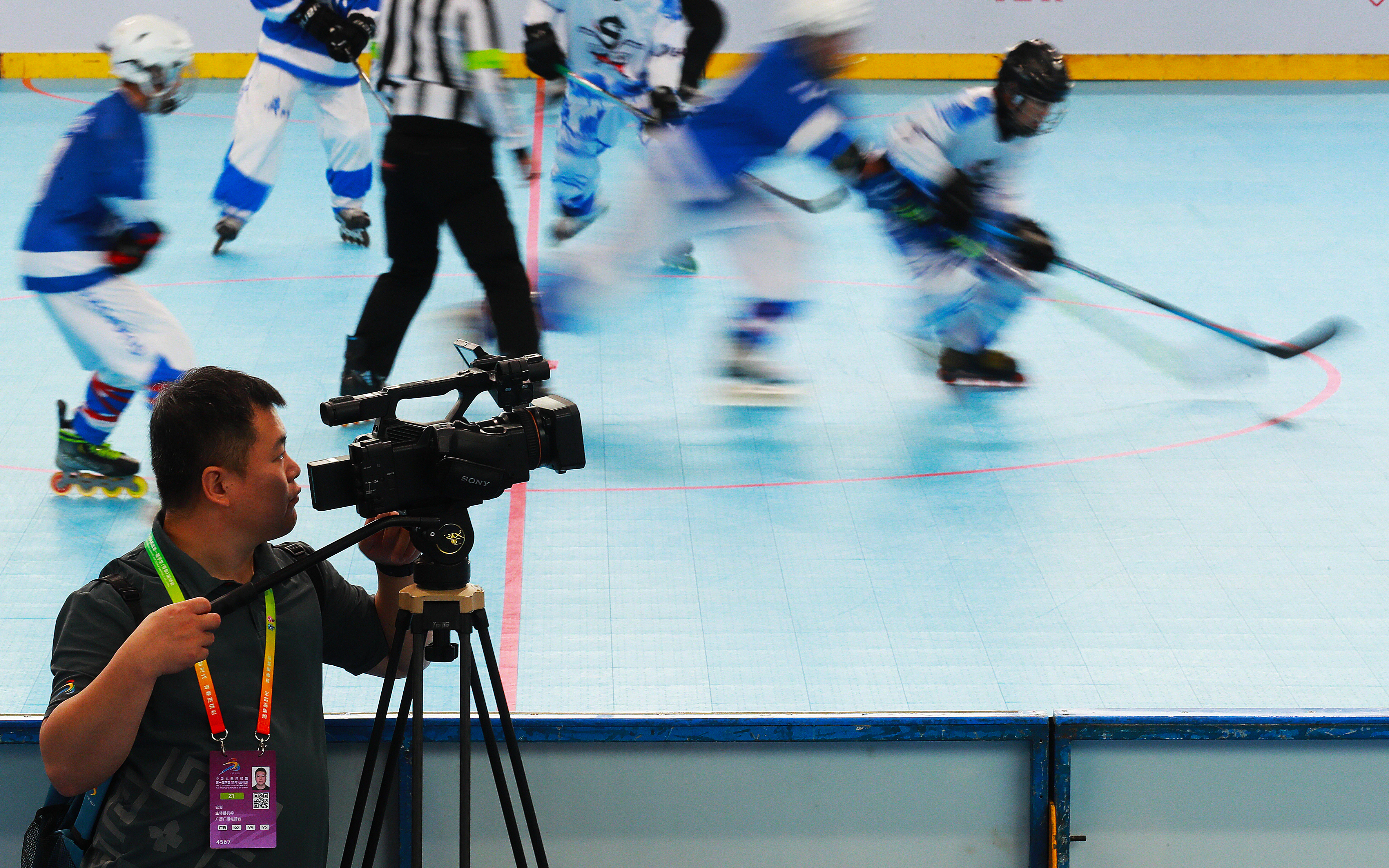 11月10日,第一屆學(xué)青會(huì)(公開(kāi)組)輪滑項(xiàng)目男子輪滑球決賽在南寧進(jìn)行,認(rèn)真執(zhí)法的裁判。