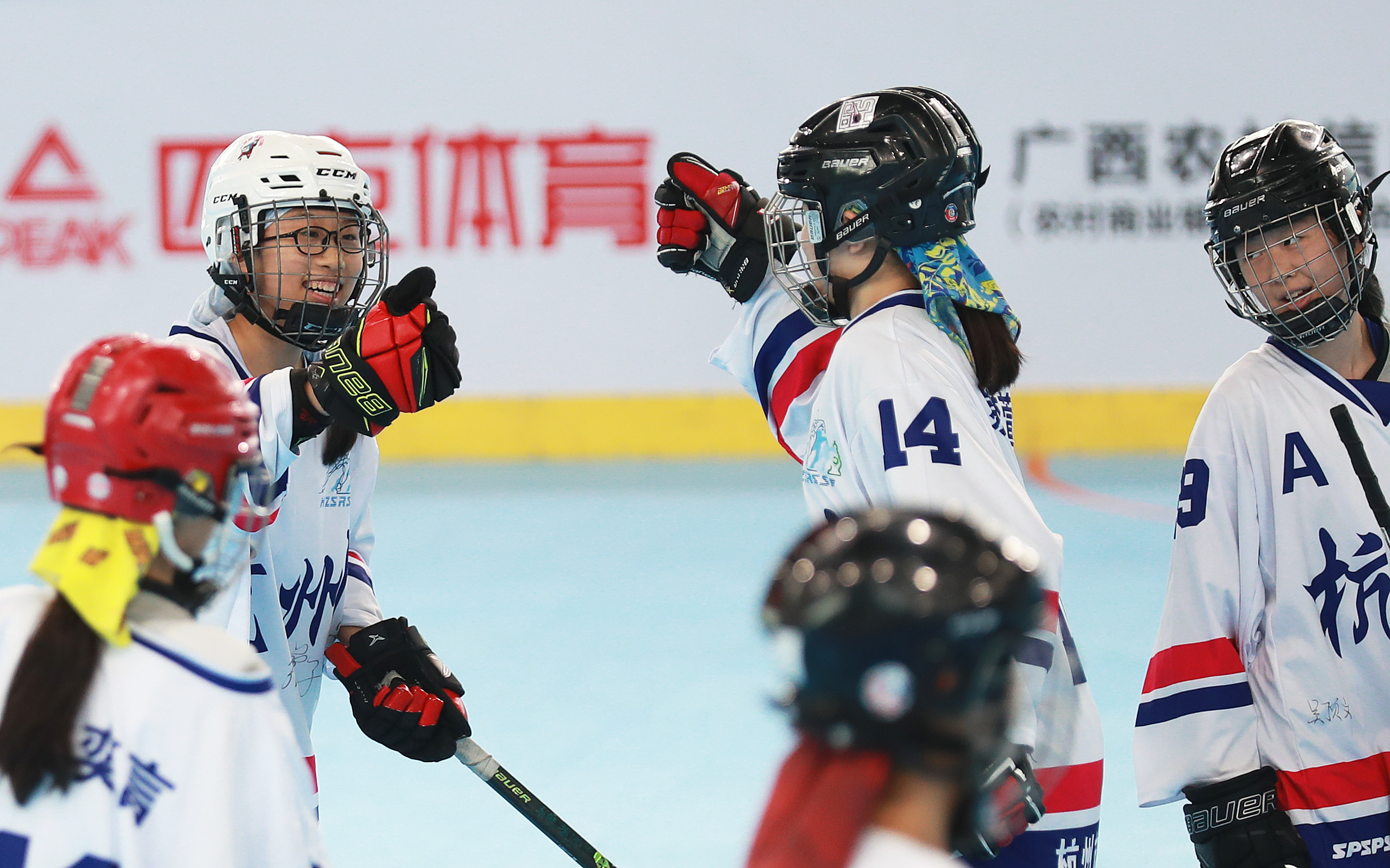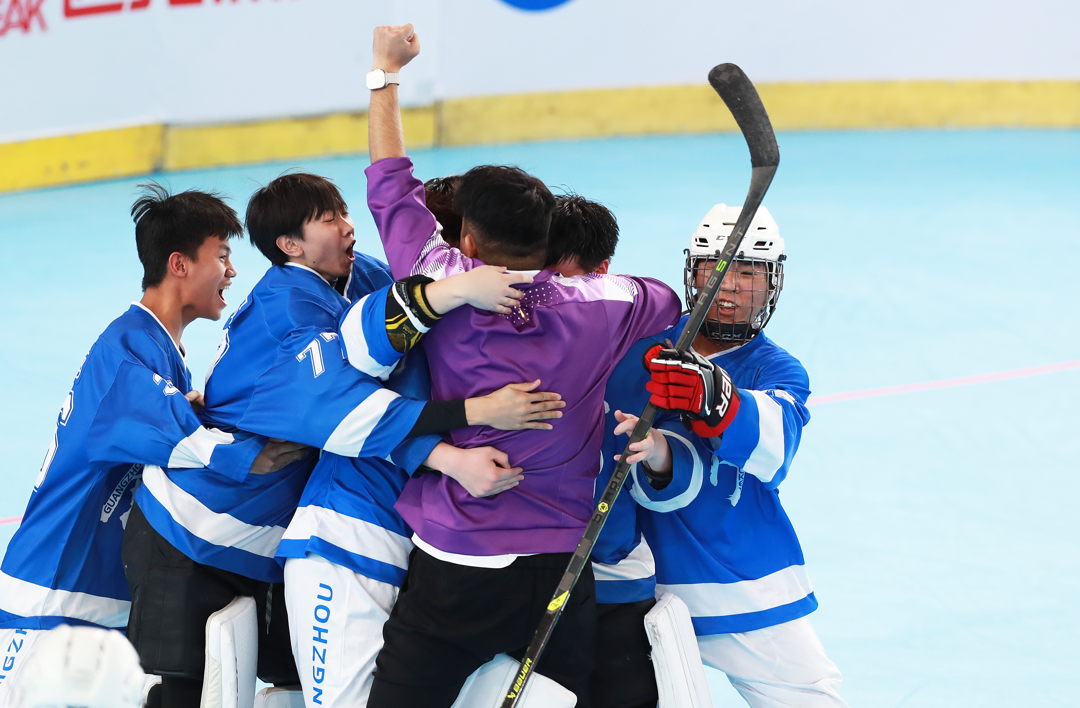 11月10日,第一屆學(xué)青會(huì)(公開(kāi)組)輪滑項(xiàng)目男子輪滑球決賽在南寧進(jìn)行,廣東廣州市隊(duì)3比0戰(zhàn)勝上海黃浦區(qū)隊(duì)獲得男子輪滑球冠軍。隊(duì)員們?cè)趹c祝勝利。廣州隊(duì)教練張國(guó)龍中場(chǎng)休息時(shí)現(xiàn)場(chǎng)指導(dǎo)。