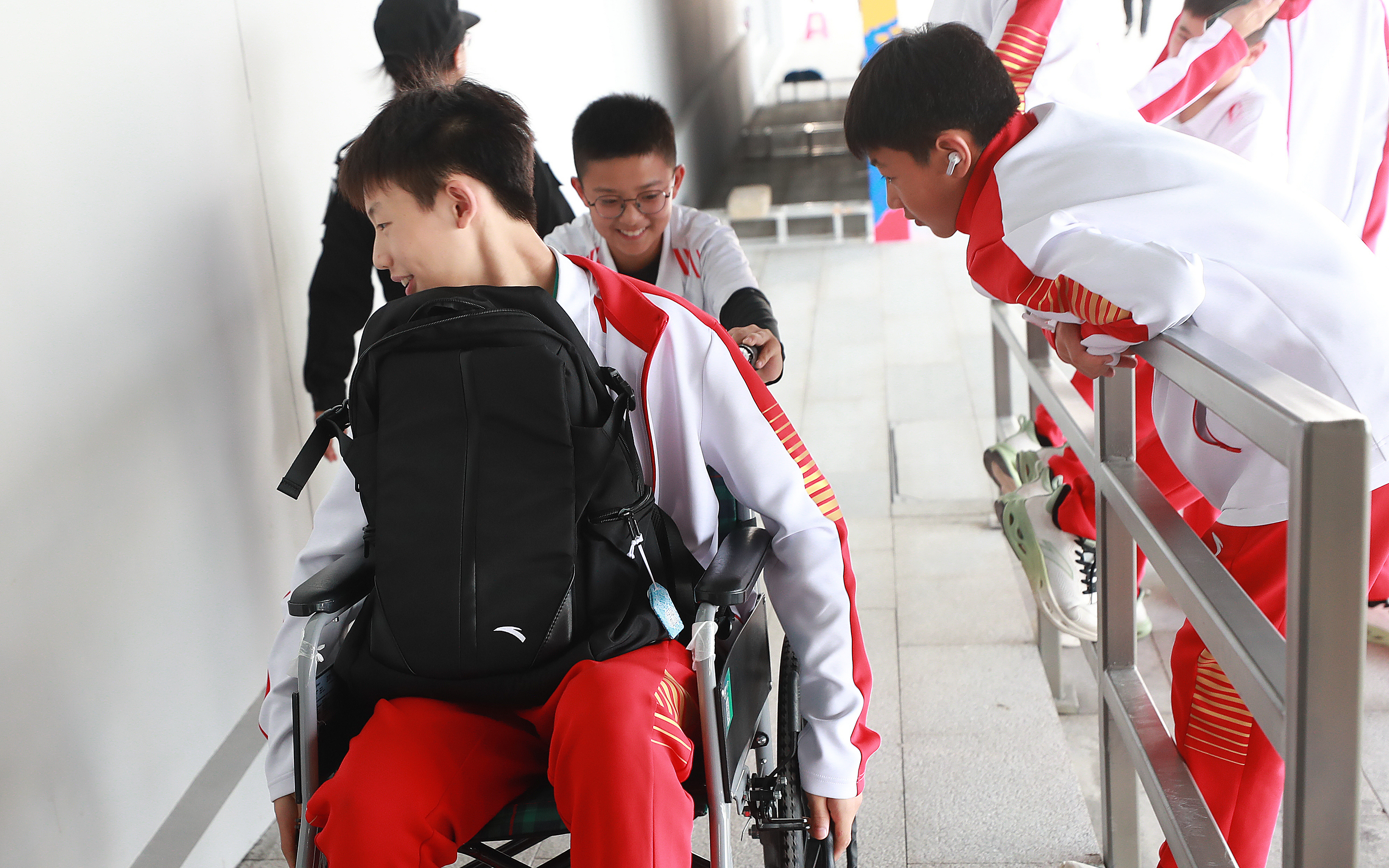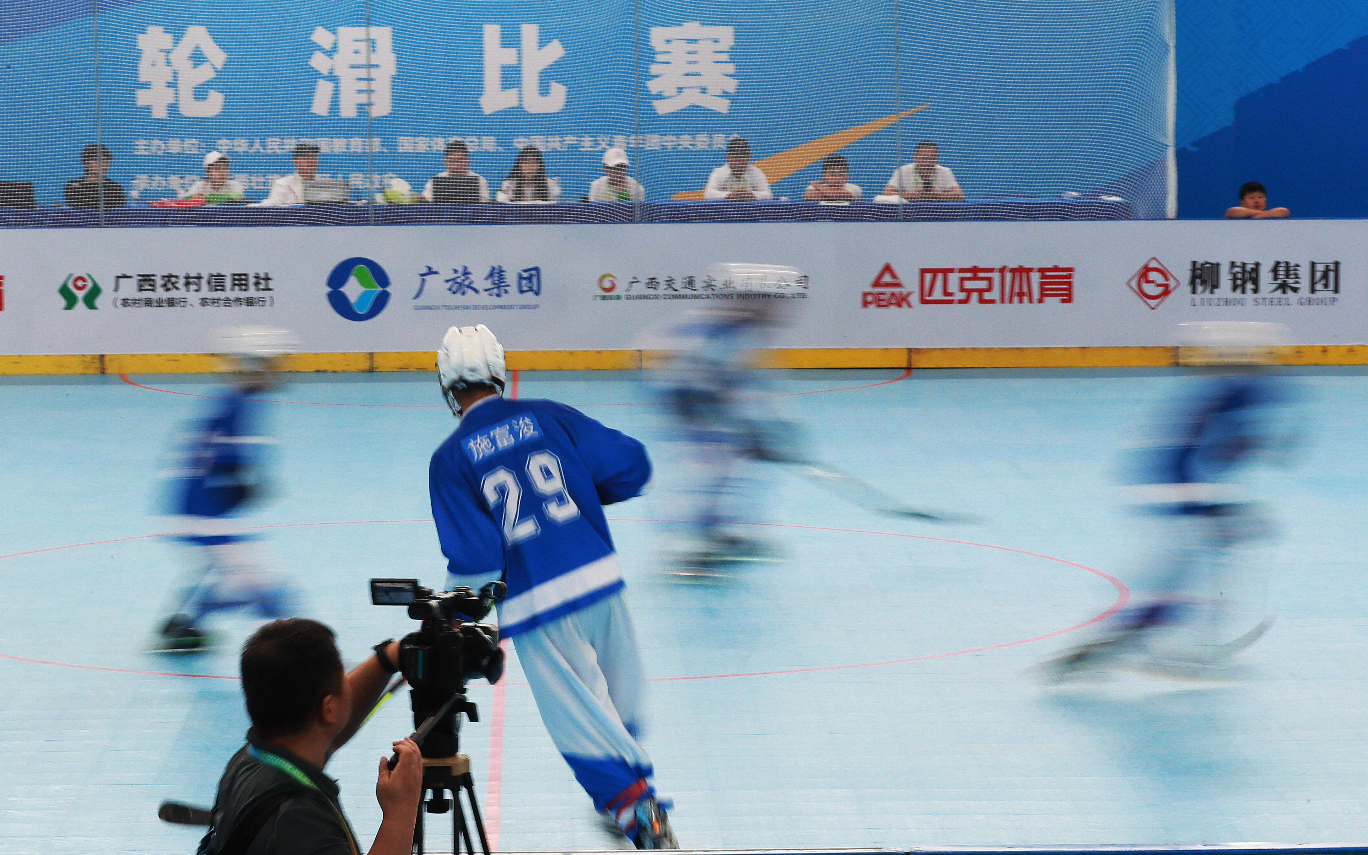 11月10日,第一屆學(xué)青會(huì)(公開(kāi)組)輪滑項(xiàng)目男子輪滑球決賽在南寧進(jìn)行。蘇州隊(duì)一名球員將隊(duì)友推到現(xiàn)場(chǎng)觀賽。