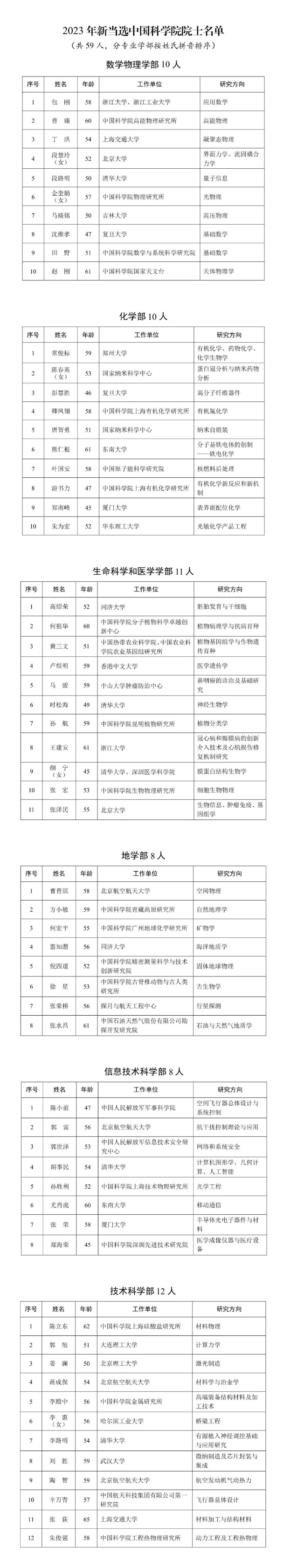 關(guān)于公布2023年中國(guó)科學(xué)院院士增選當(dāng)選院士名單的公告