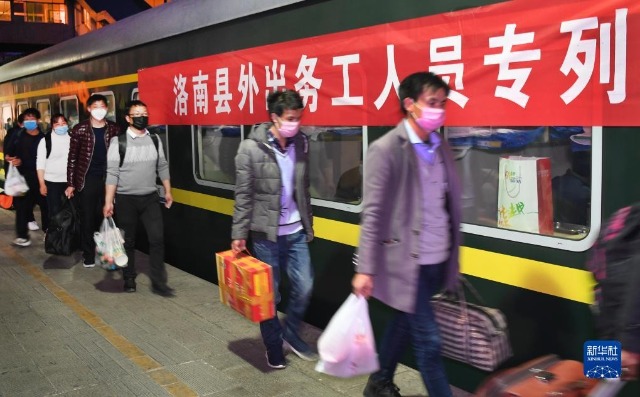 2020年2月24日,陜西省商洛市洛南縣951名務(wù)工人員乘坐西安至杭州的務(wù)工專(zhuān)列,赴長(zhǎng)三角地區(qū)工作。新華社記者 陶明 攝