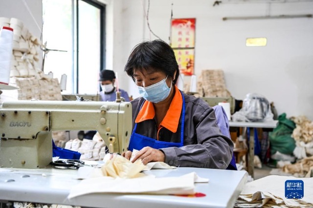 2023年11月30日,在貴港市港北區(qū)一家就業(yè)幫扶車(chē)間,當(dāng)?shù)厝罕娫诩庸诒S闷贰P氯A社記者 曹祎銘 攝