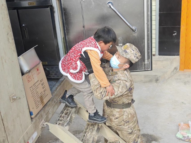 12月20日中午12:40,午飯時(shí)間剛過(guò),甘肅省積石山縣劉集小學(xué)六年級(jí)學(xué)生馬藝龍?jiān)诮值缽V場(chǎng)上和幾個(gè)同學(xué)打乒乓球。球臺(tái)后邊的保障餐車吸引了他的注意力,那有幾位他剛認(rèn)識(shí)的大朋友。