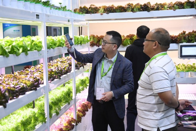 2023世界農(nóng)業(yè)科技創(chuàng)新大會11月2日至4日在北京舉行。這是2023年11月2日,工作人員(左)在世界農(nóng)業(yè)科技博覽會現(xiàn)場介紹智慧植物工廠。新華社記者 任超 攝