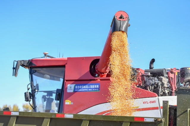 在中國科學(xué)院“黑土糧倉”科技會戰(zhàn)長春示范區(qū)公主嶺示范基地,無人駕駛農(nóng)機(jī)將收獲的玉米裝車(2023年10月19日攝)。新華社記者 張楠 攝