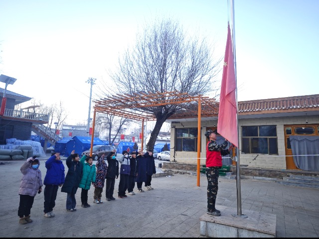 “全體都有,稍息,立正……出發(fā)?!?span style="font-family: 宋體, SimSun; font-size: 16px; margin-bottom: 10px; line-height: 2em;">12月22日,震后第4天,清晨7點(diǎn)40,甘肅省積石山縣劉集鄉(xiāng)高李村一社安置點(diǎn)幾排帳篷中間的空地傳來中氣十足的整隊口號,10多名學(xué)生排著整齊的隊伍,跟著“教官”齊步前進(jìn)。今天,他們要在安置點(diǎn)前的小廣場舉行升國旗儀式,隨后開啟他們的災(zāi)后“第一課”,這一刻起,高李村一社臨時“帳篷學(xué)?!背闪⒘恕?/p>