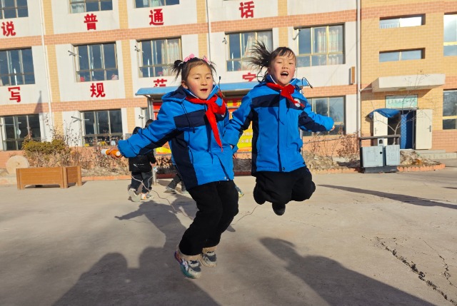 12月25日,陽山希望小學(xué)的課間時分,五年級學(xué)生趙永蘭和小伙伴開心地在操場上比賽跳繩。