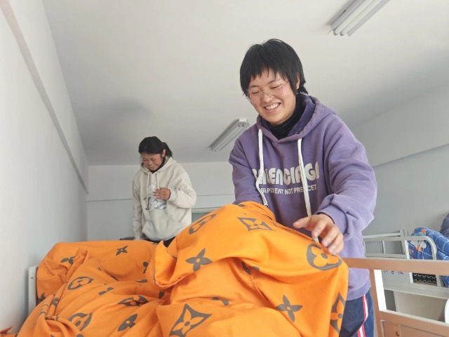 學(xué)生動手整理為他們準(zhǔn)備的新被褥。