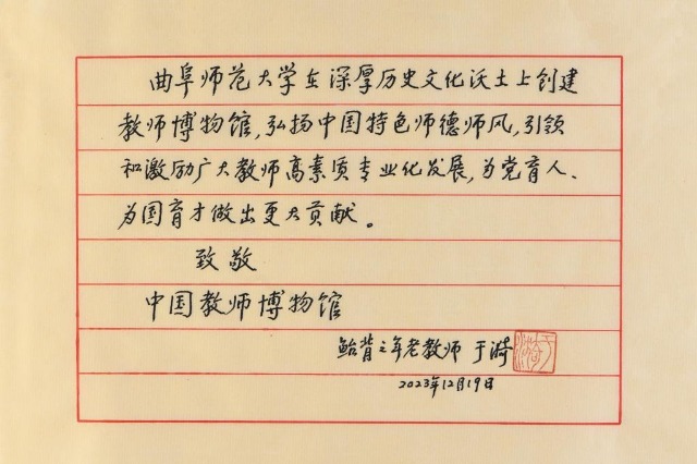離開家中前,邢光表示于漪先生受聘榮譽館長是博物館發(fā)展中的標(biāo)志性事件,將激勵全校師生進(jìn)一步辦好孔子家鄉(xiāng)大學(xué)、建好國家級師德教育基地,努力創(chuàng)造新的成績,不辜負(fù)先生的厚望,并由衷地祝福先生身體康泰、吉祥如意。