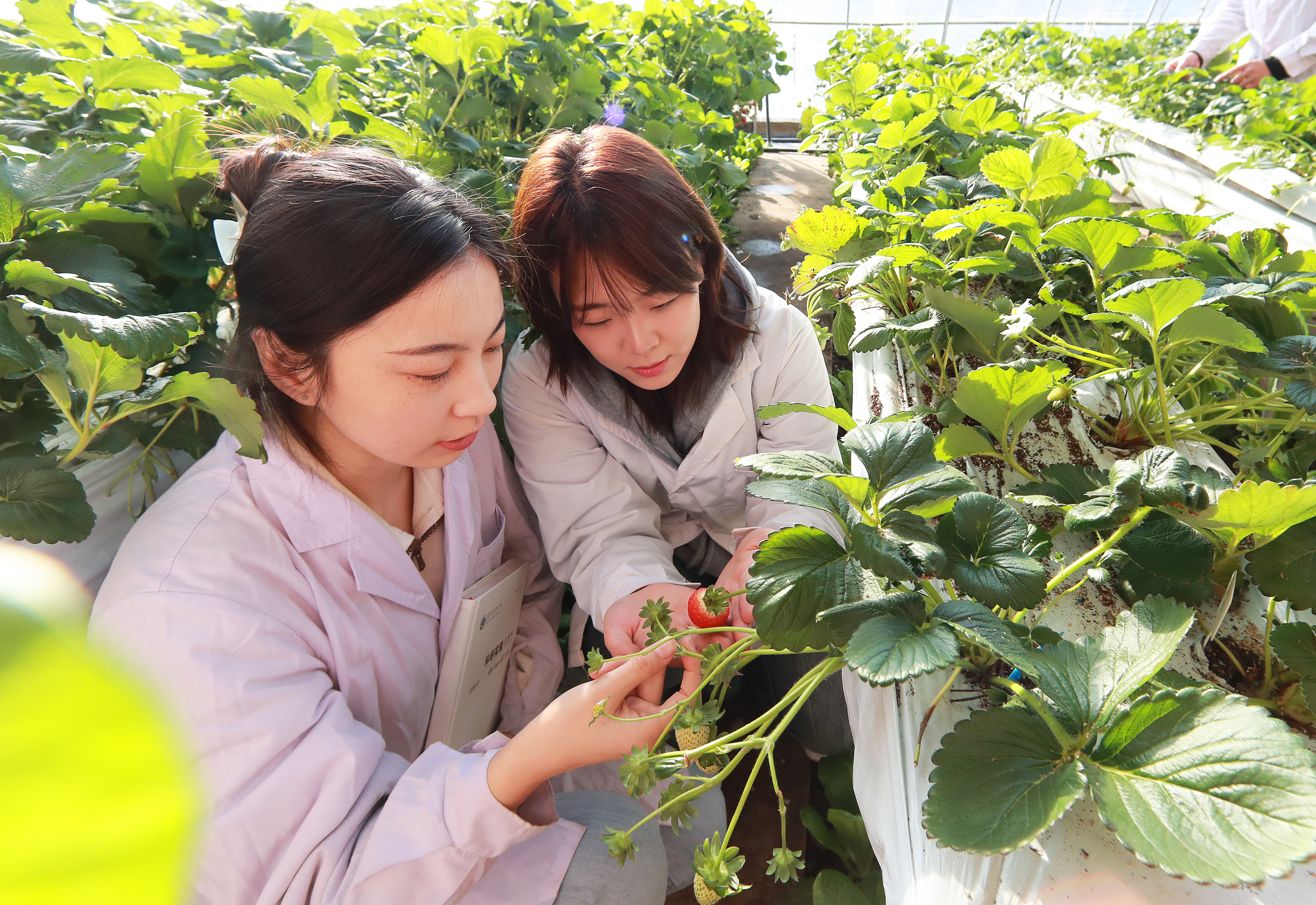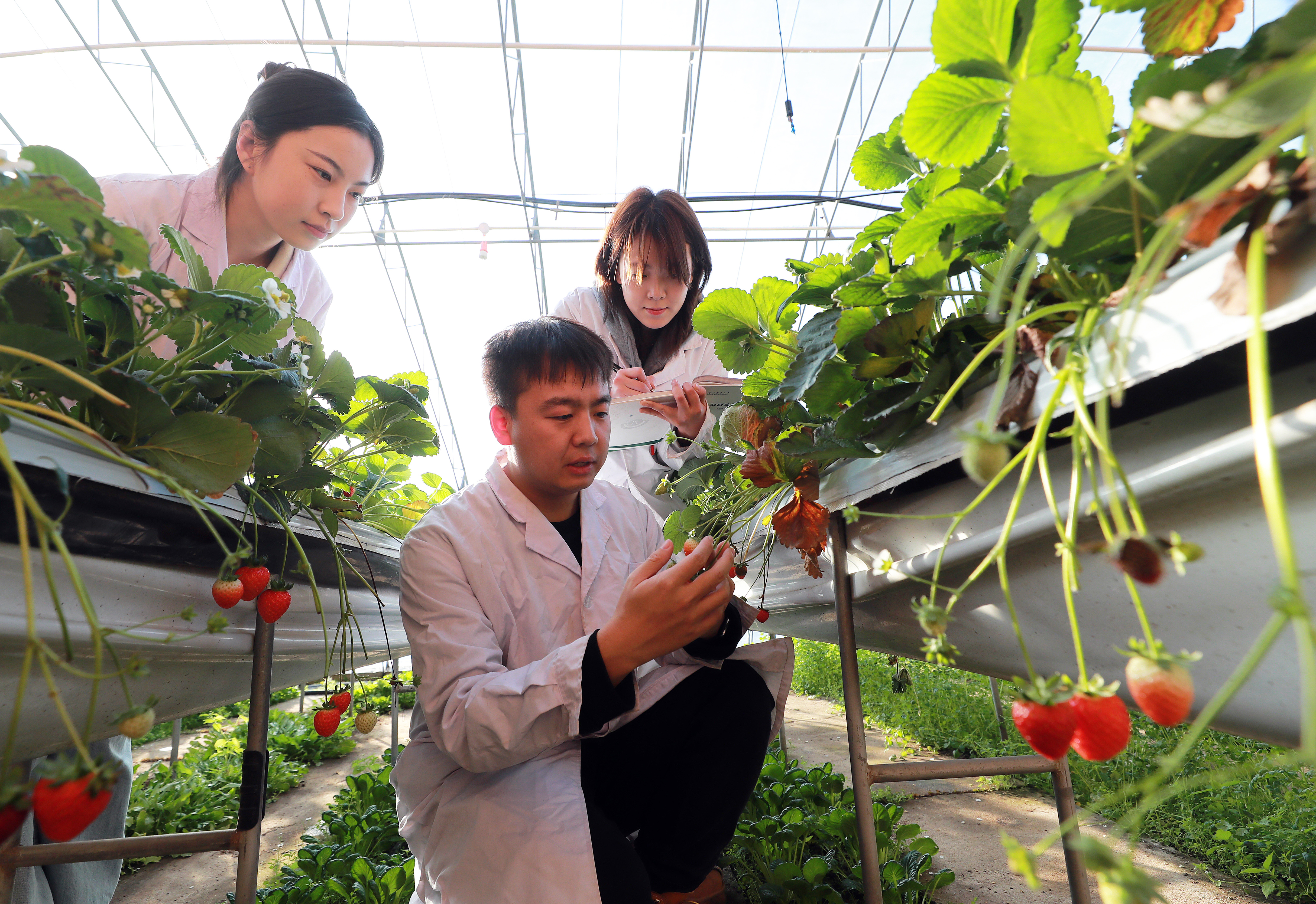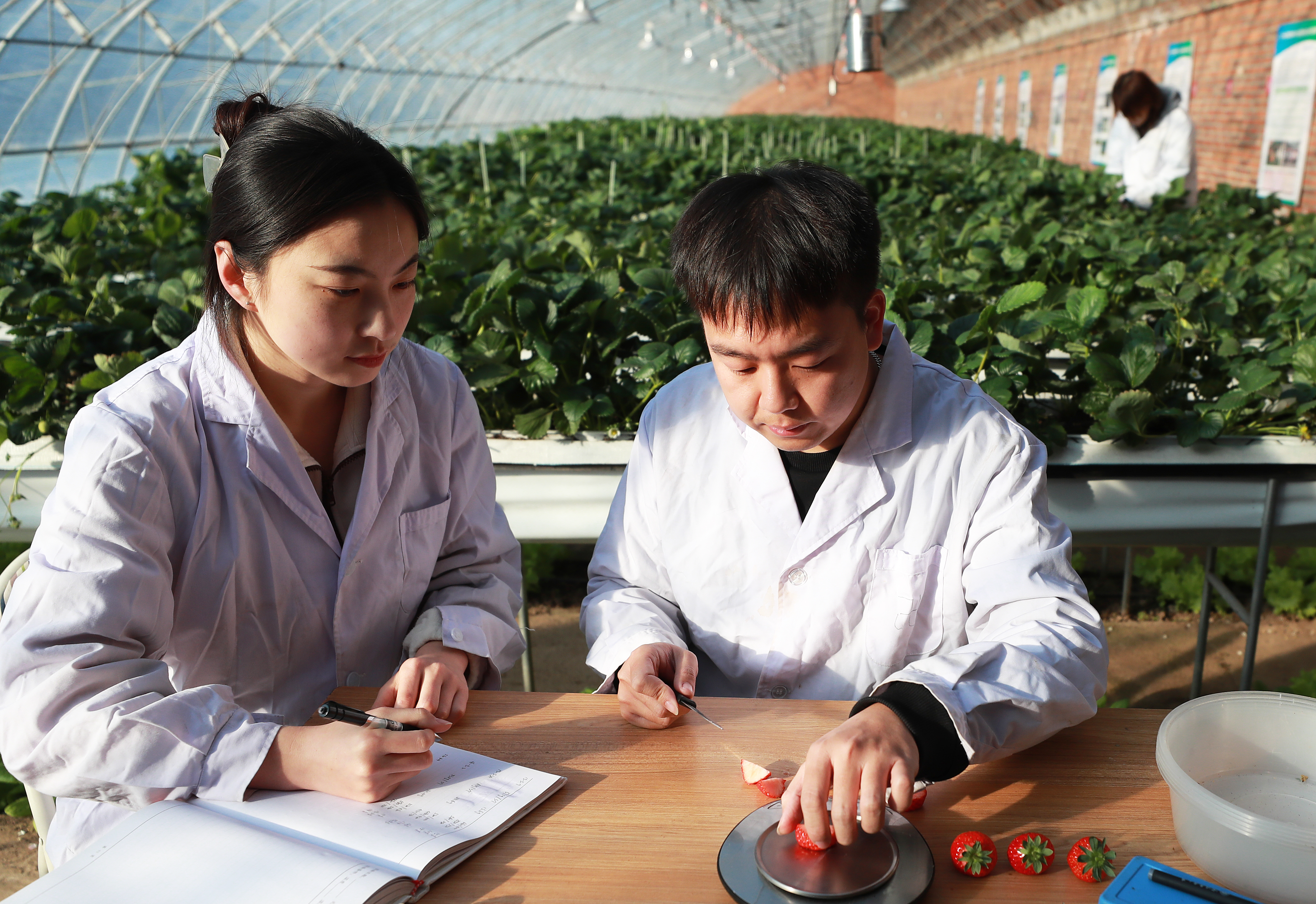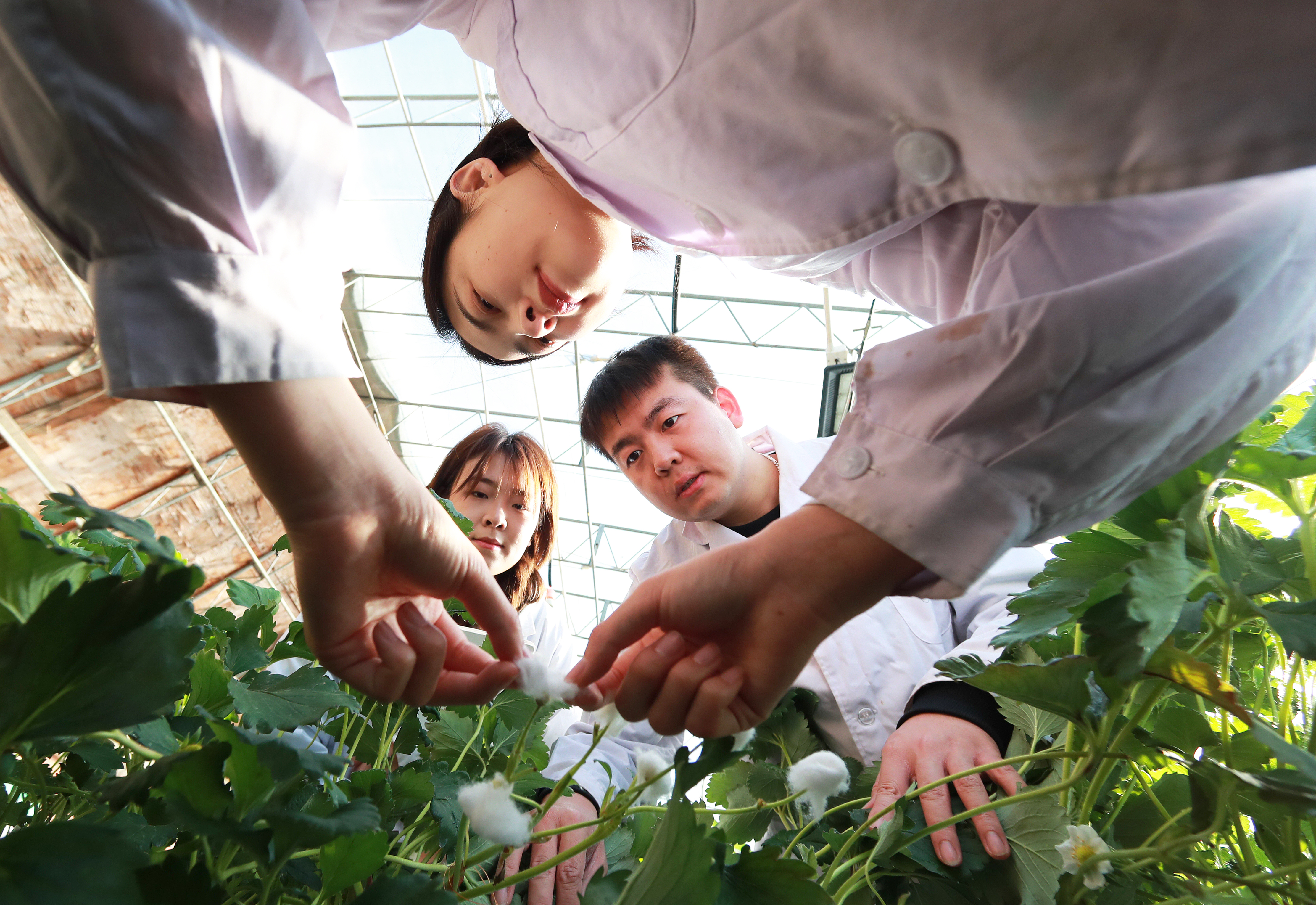 1月5日,沈陽(yáng)農(nóng)業(yè)大學(xué)遼寧省草莓育種與優(yōu)質(zhì)栽培重點(diǎn)實(shí)驗(yàn)室,研究生李祎鳴(左)、張超(中)和姚秀樺在觀(guān)察記錄草莓一級(jí)序果與二級(jí)序果的表型差異。