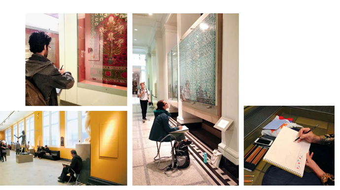 在現(xiàn)場選取臨摹對象時,我再次將學(xué)生未來會在學(xué)院學(xué)習(xí)的各種實踐專業(yè)課融入博物館藏品中,要求每位學(xué)生至少選取3種與專業(yè)課相關(guān)的媒介作為臨摹對象,如中東細密畫、陶瓷、雕刻、地毯等,在設(shè)計、比例、色彩、材質(zhì)、制作方法、歷史背景、關(guān)聯(lián)性等方面將自己對傳統(tǒng)藝術(shù)的興趣點串聯(lián)起來并明確思路,臨摹時著重記錄自己的反思性思考,并在下午4點集合進行小組展示和討論。